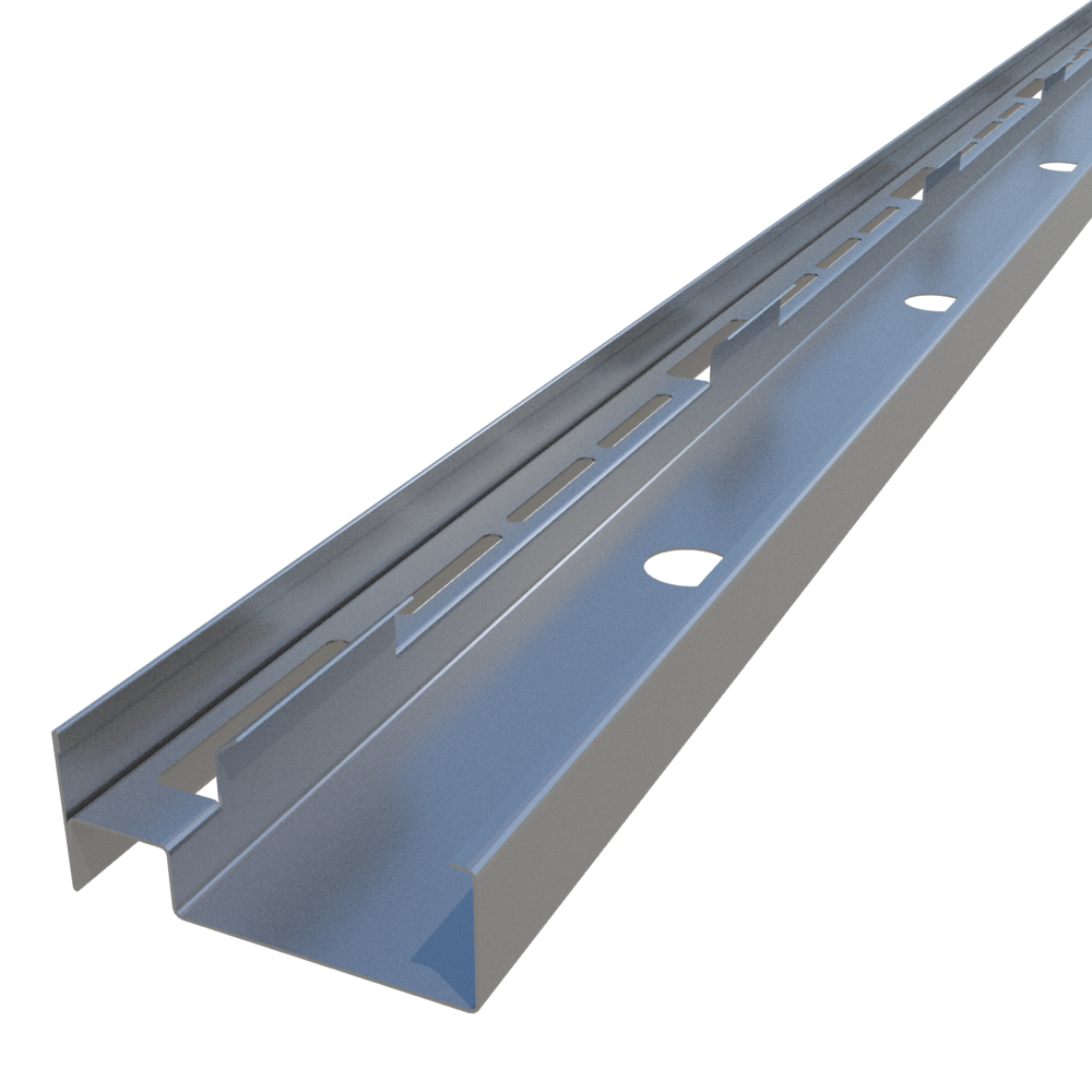 ClarkDietrich J-Track is used at the floor and ceiling in shaftwall assemblies. C-T studs and gypsum shaftliner panels are friction fit between the top and bottom J-Tracks. J-Tracks have unequal legs. The longer leg (available in 2-1/4" and 3") is installed against the shaft. The leg provides a backstop for easy installation of the liner panel. Three-inch leg track is typically used as a jamb strut around closure details, including duct and door openings, abutments and intersections.
