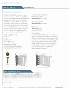 A FastClip deflection clip installs quickly with screws or powder-actuated fasteners, and provides adjustable standoff to ensure a plumb wall plane. Proprietary Deflection Screws are provided with each clip to ensure friction-free sliding. Each clip is also embossed with fastening patterns to ensure accurate placement of fasteners.